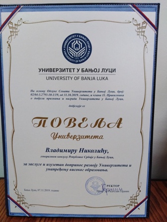 Banja Luka: Generalni konzul Nikolić dobio Povelju za doprinos razvoju Univerziteta