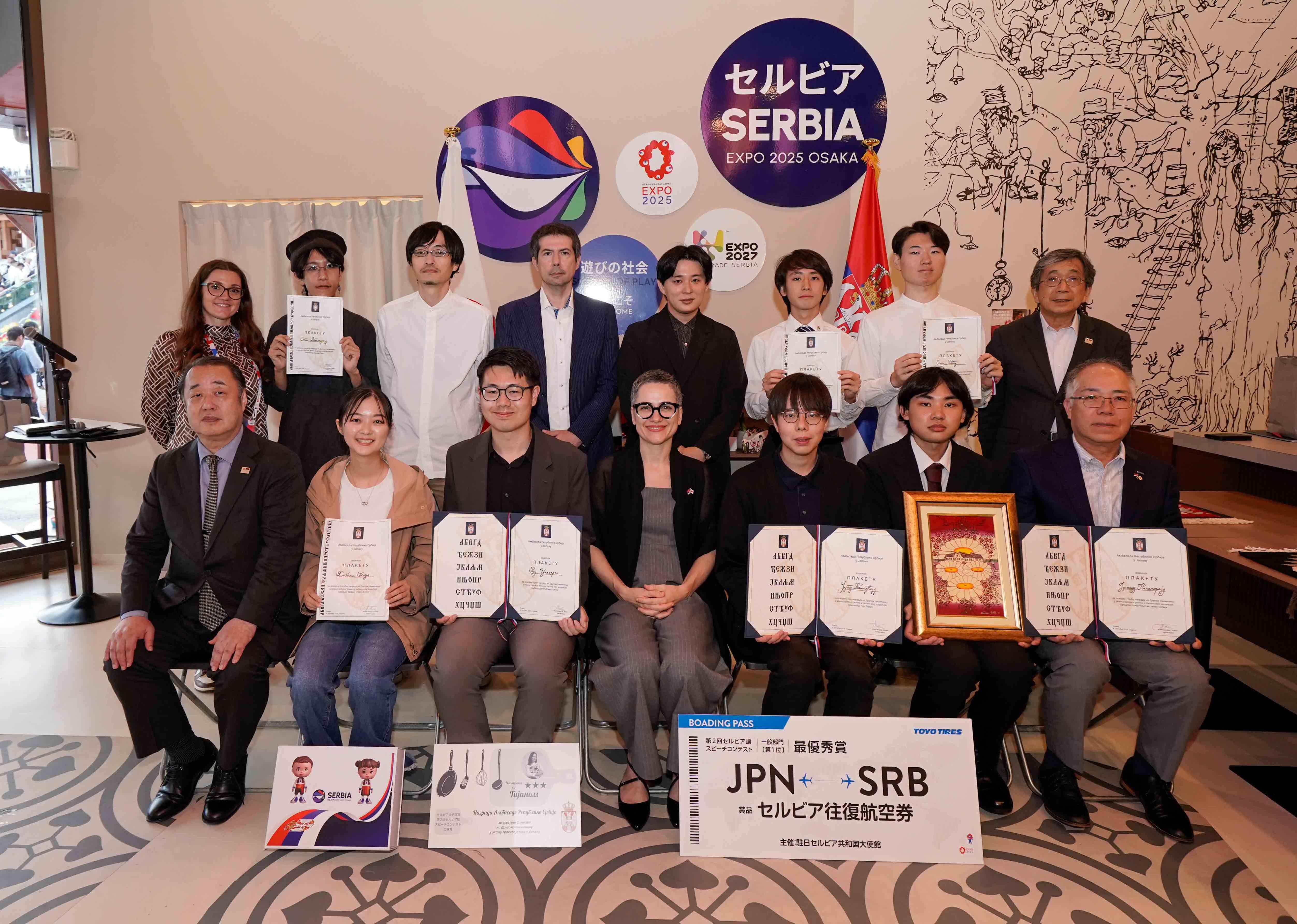 У Павиљону Србије на Светској изложби у Осаки одржано је Друго такмичење у знању српског језика у Јапану. Такмичење је организовала Амбасада Републике Србије у Јапану, у сарадњи са тимом Србије за Експо 2025, Градским универзитетом у Кобеу и Универзитетом у Осаки, а организацију су подржали Министарство спољних послова Јапана, Почасни конзулат Републике Србије у Осаки и Друштво пријатељства Јапан-Србија. Такмичењу је присуствовао Арно Гујон, директор Канцеларије за јавну и културну дипломатију.